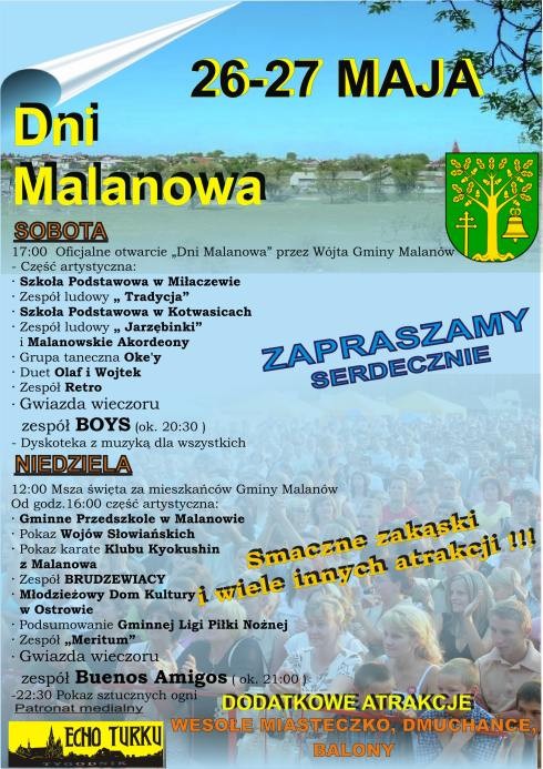 9 maja, 2007 Plakat Pozostałe aktualności 5 czerwca, 2007 Galeria zdjęć - V Dni Malanowa 2007 4 czerwca, 2007 Gazeta Malanowska o V Dniach Malanowa